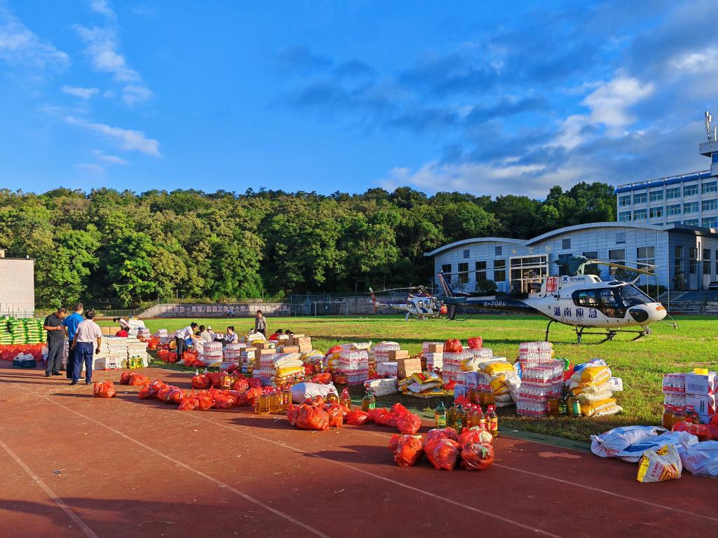 “快!直升机来了,准备搬运物资!”7月30日一大早,在湖南省资兴市第一中学,志愿者们听到指令后冲到操场。在螺旋桨轰鸣声中,他们迅速将摆放在草坪上的矿泉水、大米、食用油等物资搬运上直升机。