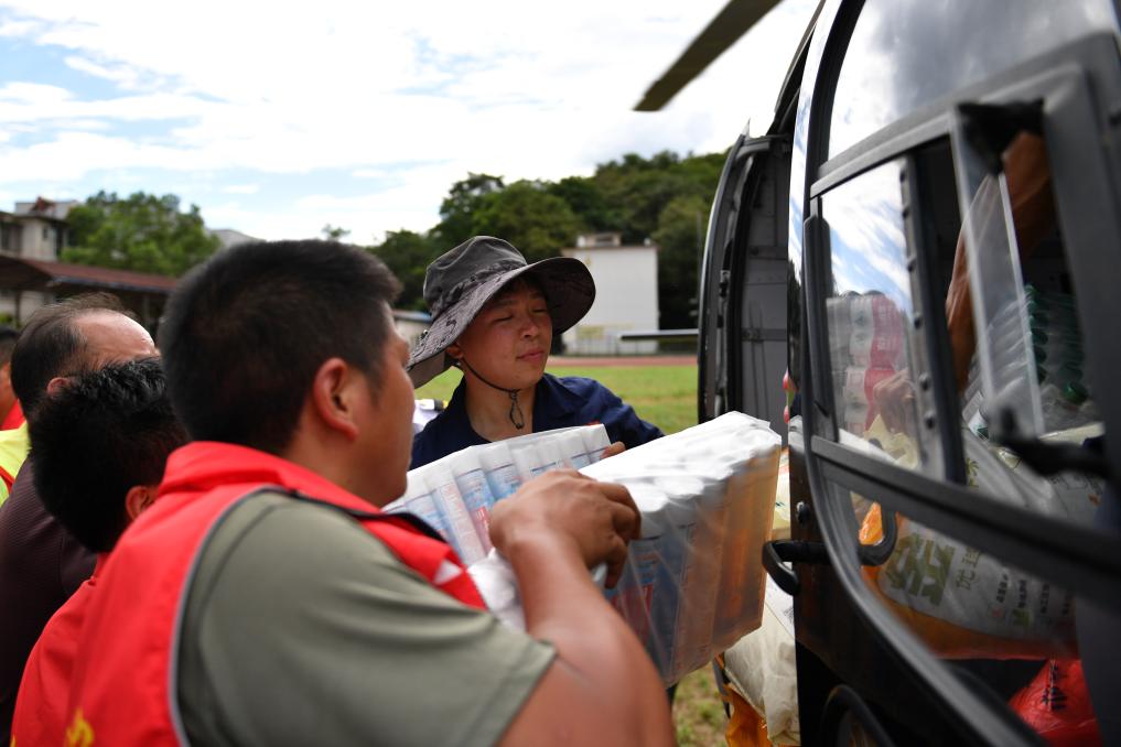 7月29日,在资兴市第一中学,志愿者将物资搬运上直升机。新华社记者 陈振海 摄