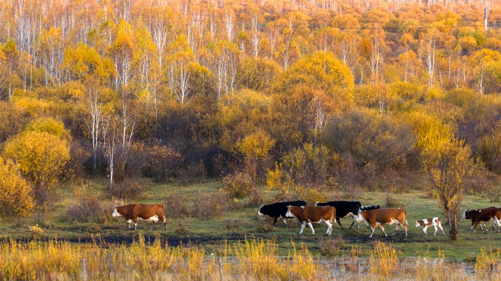 2025年9月25日,在内蒙古呼伦贝尔市额尔古纳市恩和俄罗斯族民族乡,牛群在林间吃草(无人机照片)。新华社记者 马金瑞 摄