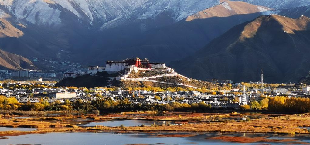 2022年10月29日,从拉鲁湿地方向遥望布达拉宫。深秋已至,位于西藏拉萨的世界文化遗产布达拉宫在高原秋色的衬托下分外美丽。 新华社记者 沈虹冰 摄
