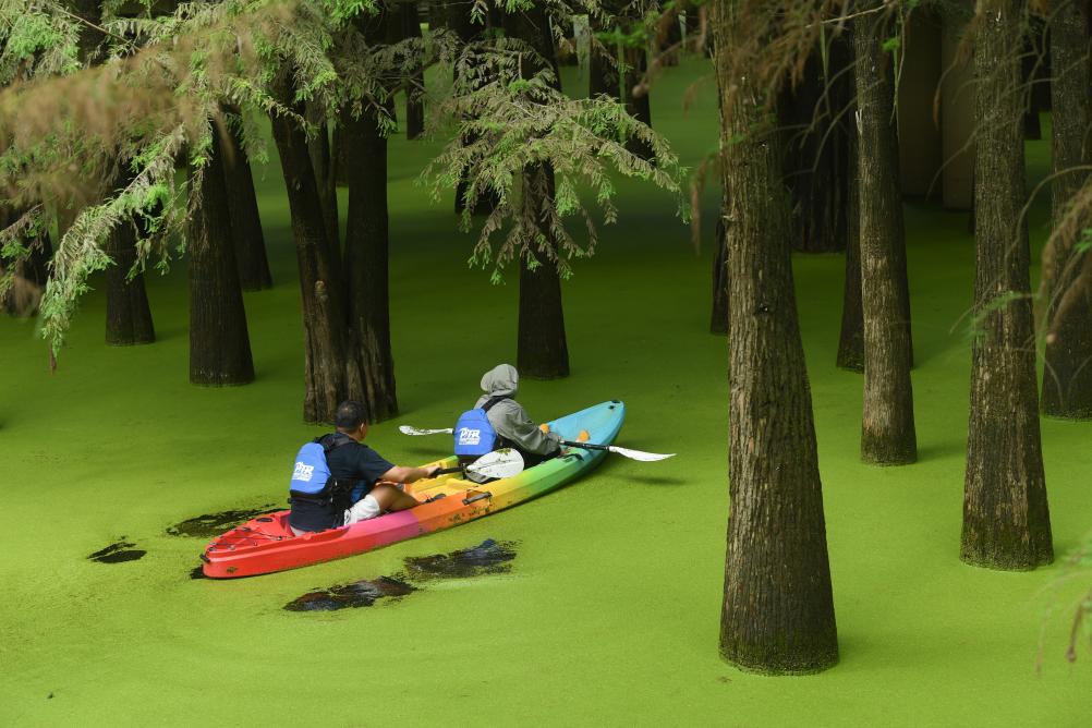 2024年9月4日,游客在水上森林泛舟。初秋时节,杭州青山湖水上森林近百亩池杉、落羽杉和水面的浮萍相映成趣,呈现出幽静的生态景观。新华社记者 翁忻旸 摄