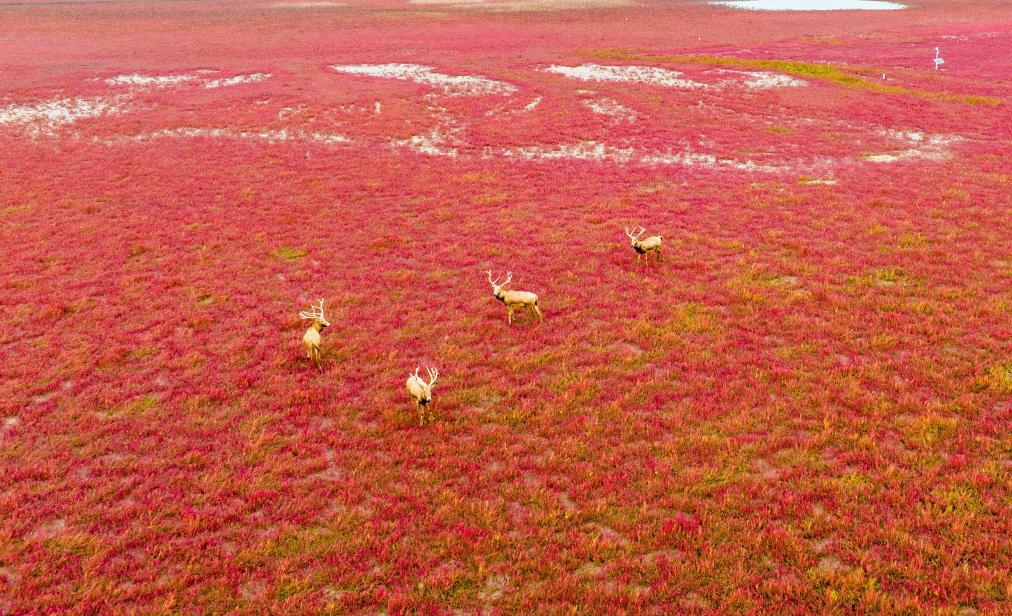 2024年10月16日,在江苏东台条子泥湿地,麋鹿在盐蒿地栖息。新华社发(孙家录摄)