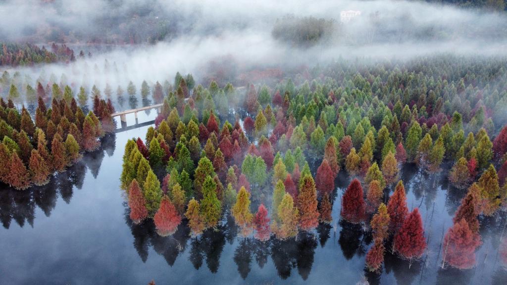 2022年11月21日,云南省昆明市盘龙区滇源街道甸尾村水杉湿地的水杉林色彩艳丽,景色如画。 新华社发(费超 摄)