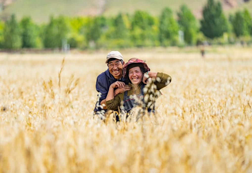 2025年9月23日,西藏拉萨市林周县松盘乡岗巴村农民喜迎丰收的笑脸。 新华社记者 丁增尼达 摄