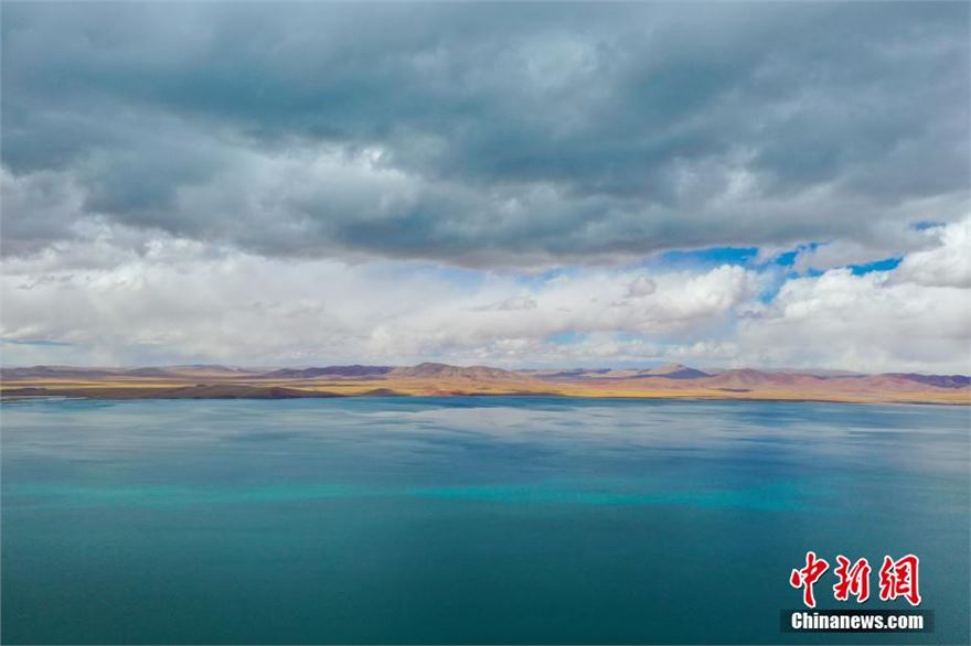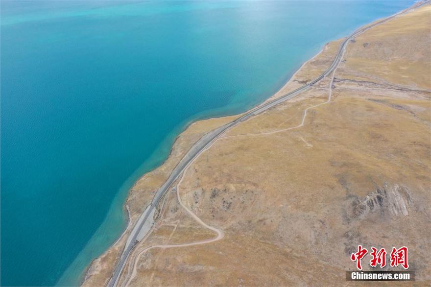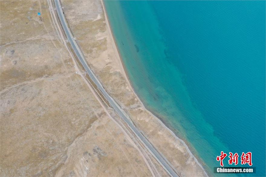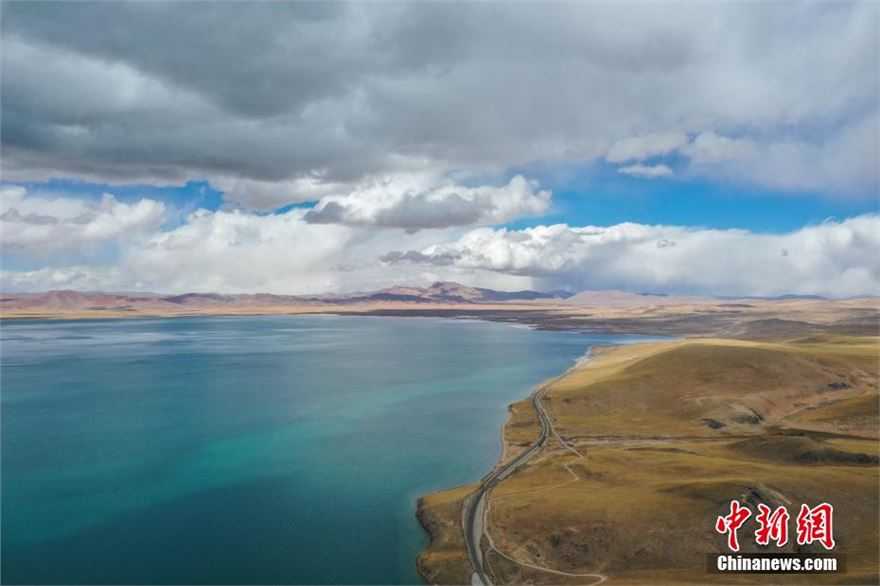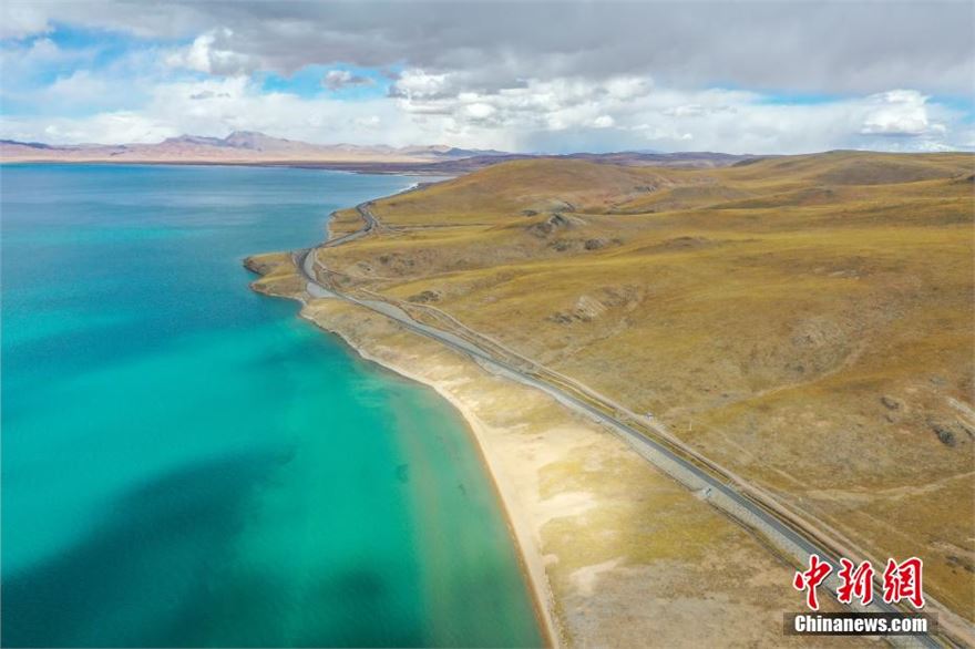 10月24日,鸟瞰深秋时节的错那湖,美景如画。错那湖位于西藏自治区那曲市安多县境内,是怒江的源头湖。湖水在阳光的照耀下,波光粼粼,湖岸线蜿蜒曲折,与周围的山脉、铁路、草原共同描绘出一幅美丽的画卷。