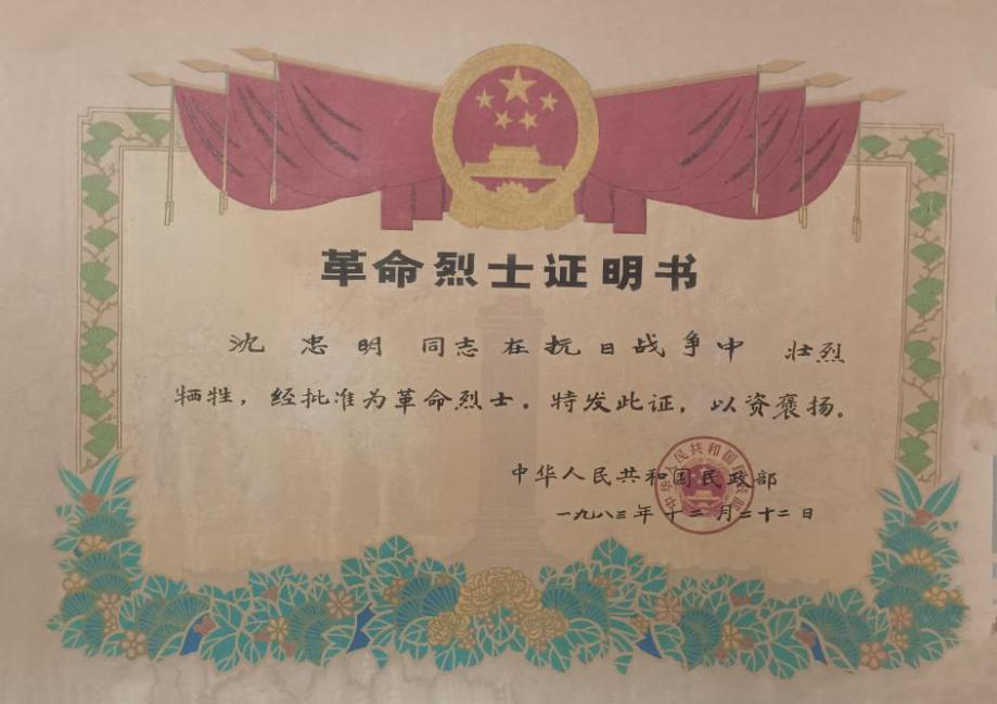 沈忠明的烈士证书。新华社发