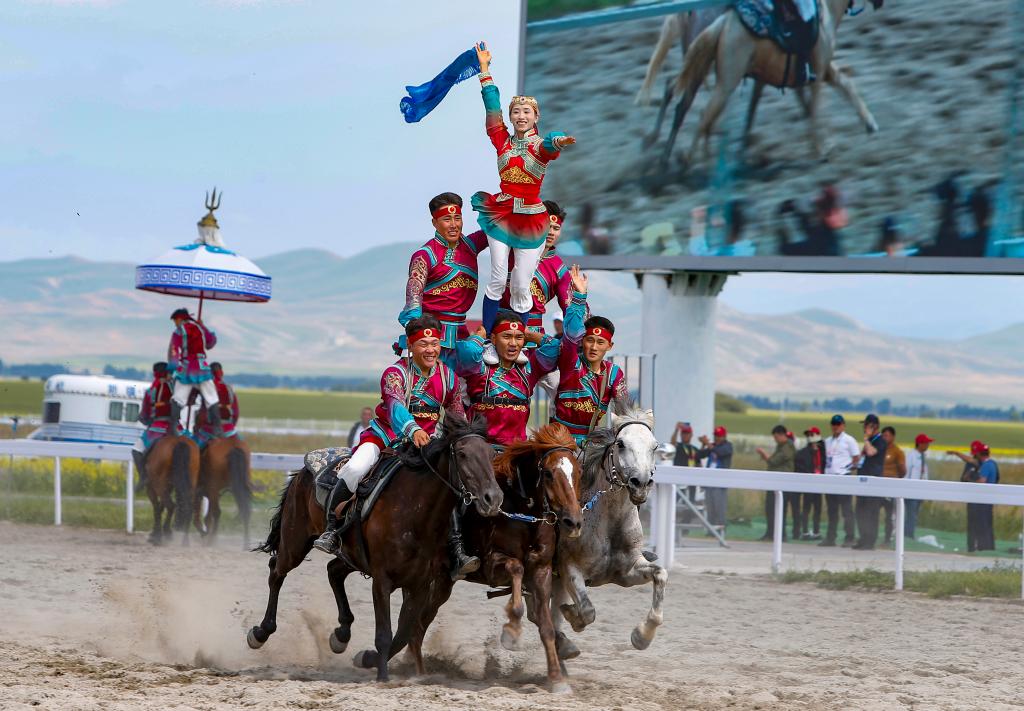 7月8日,内蒙古代表团运动员参加表演项目技巧类马上技巧比赛。新华社记者 陈朔 摄