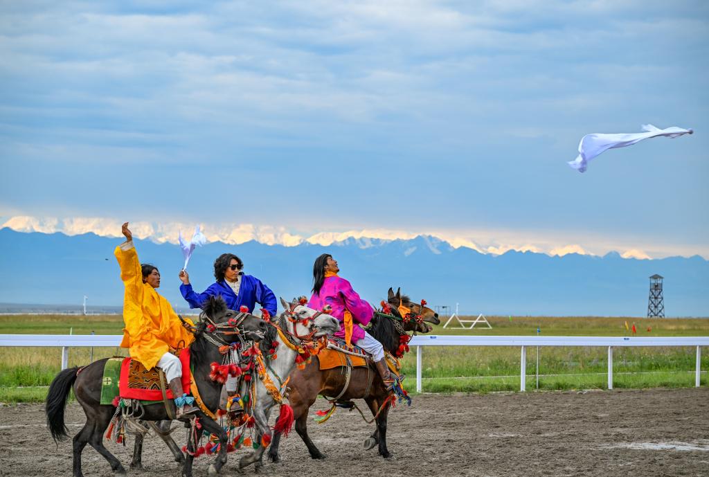7月10日,青海代表团运动员在参加表演项目技巧类康巴马术比赛前向观众投掷哈达致意。新华社记者 陈朔 摄