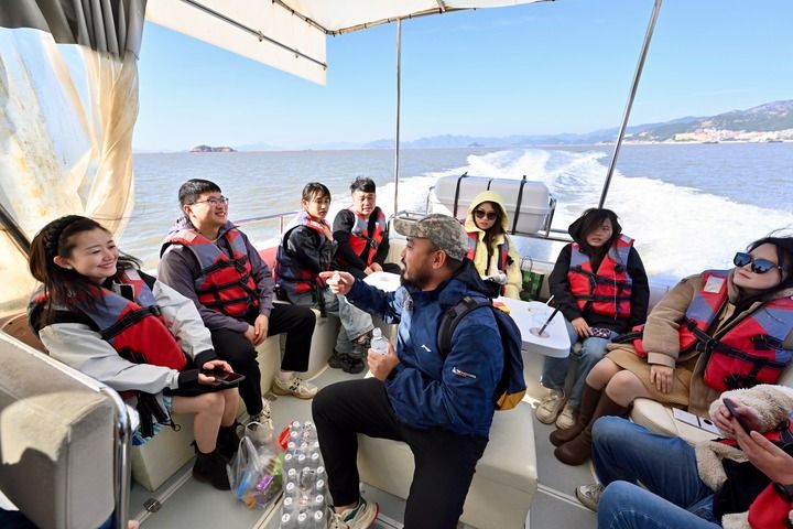 2024年11月29日,霞浦县旅游业者姜瑜带领游客乘船海上游览。