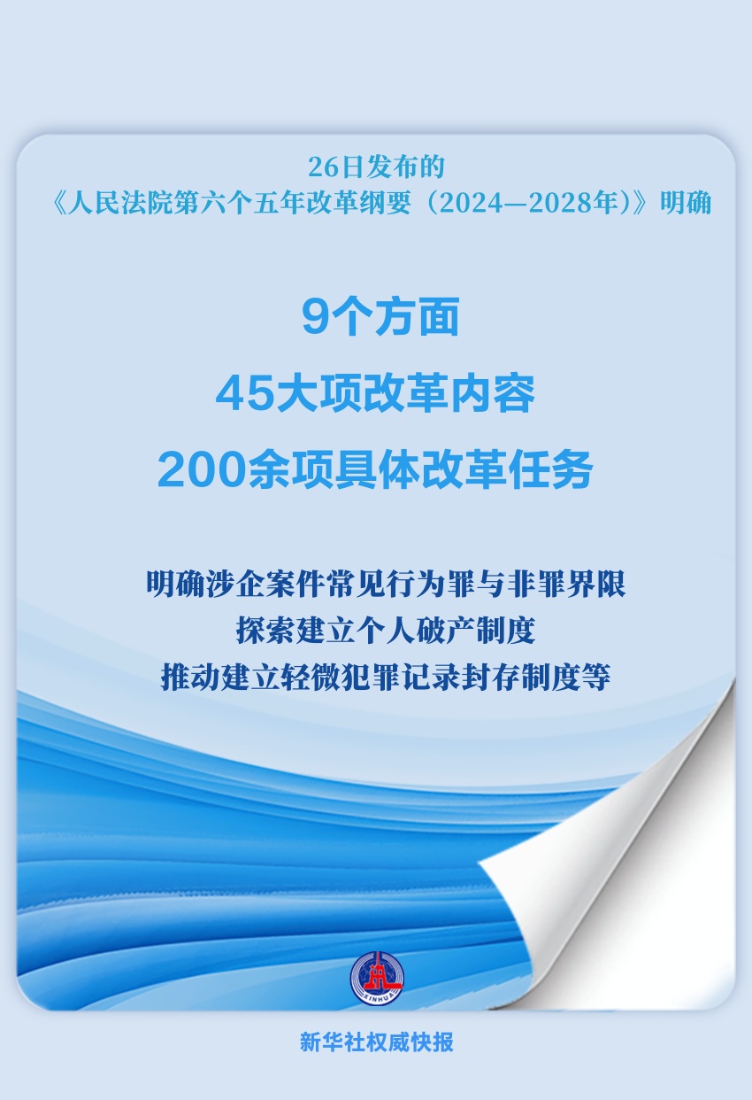 最高人民法院12月26日发布《人民法院第六个五年改革纲要(2024—2028年)》,科学系统谋划未来一个时期人民法院司法改革工作,健全公正司法体制机制,加快建设公正高效权威的社会主义司法制度。