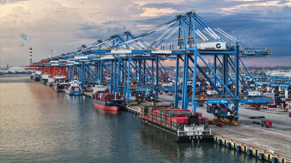 2025年9月16日,海轮在钦州港码头装卸货物(无人机照片)。新华社记者 张爱林 摄