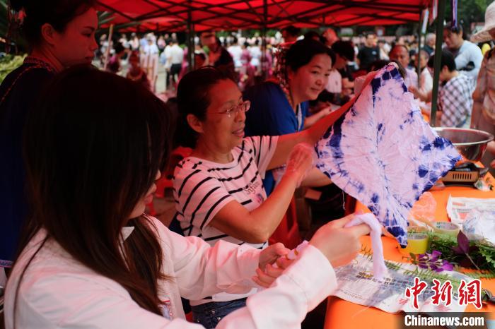 图为一位民众展示自己制作的扎染作品。刘俊聪 摄