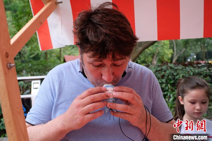 图为一名国外友人体验吹奏陶笛。刘俊聪 摄