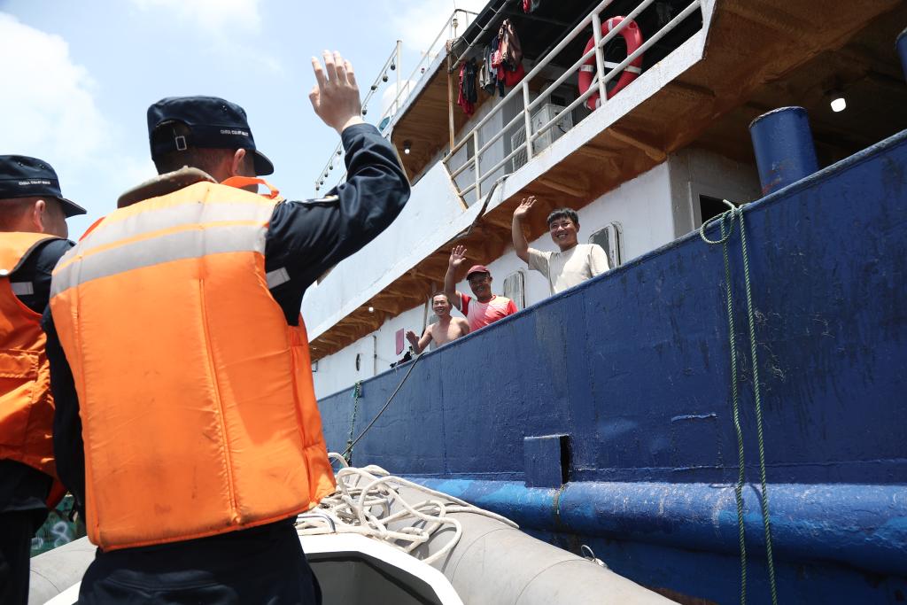 4月12日,在黄岩岛海域,中国海警执法员完成渔船登检任务后与中国渔民挥手告别。