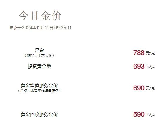 周六福、周大生、金至尊、潮宏基等品牌也均保持在788元/克的水平。此外,老凤祥、老庙黄金、千禧之星等品牌的黄金价格也有所下跌,但跌幅略有不同。