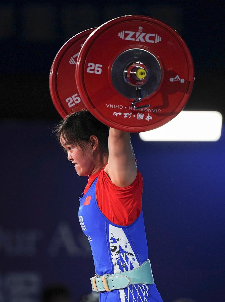 5月13日,中国选手吴艳在挺举比赛中。最终,她获得抓举、挺举、总成绩三项冠军。新华社记者 侯昭康 摄