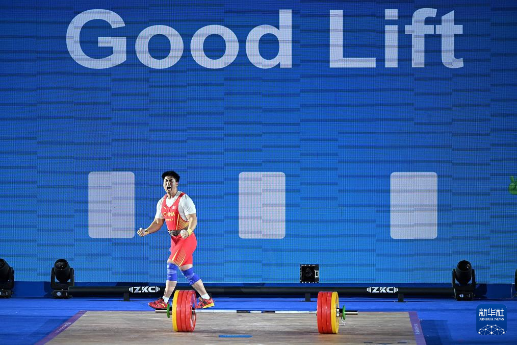 5月13日,中国选手钱飞翔在挺举比赛中庆祝最后一次试举成功。最终,他获得抓举、挺举两项季军和总成绩第四名。新华社记者 侯昭康 摄