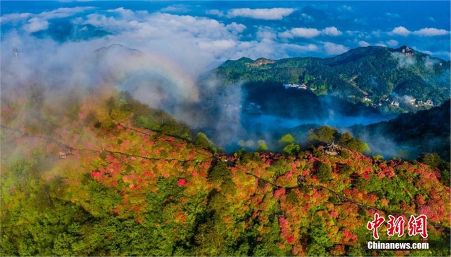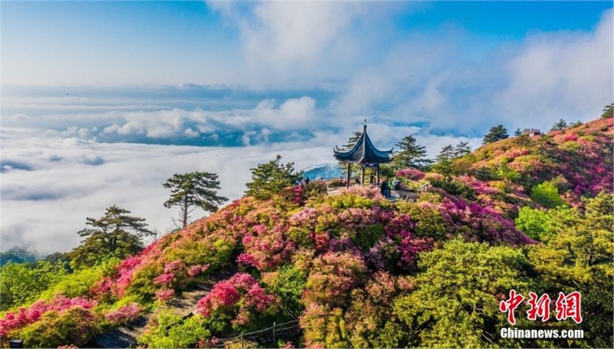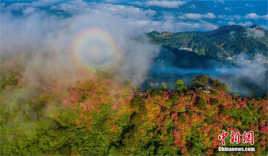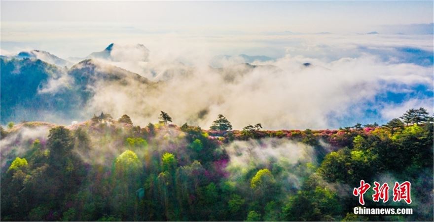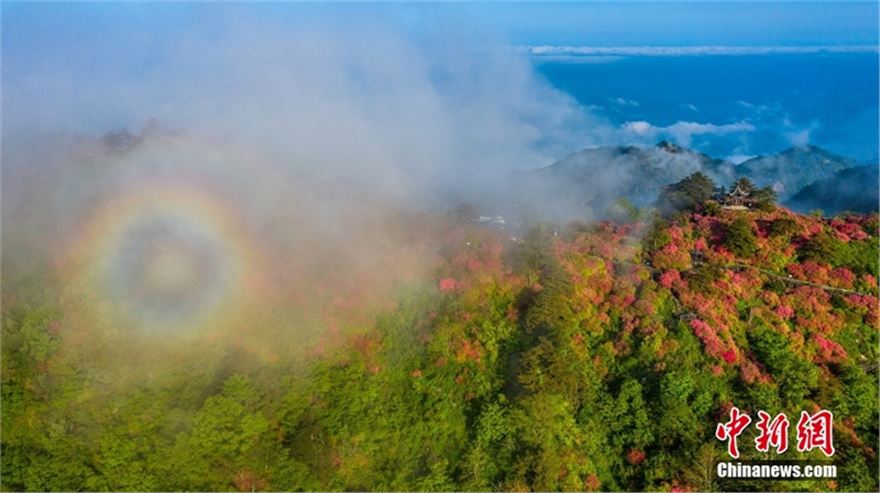 2024年4月29日,湖北黄冈麻城龟峰山十万亩杜鹃花盛开,山上出现云海和“圈型”彩虹景观。