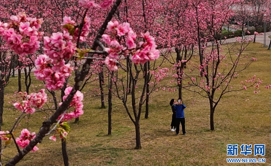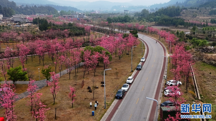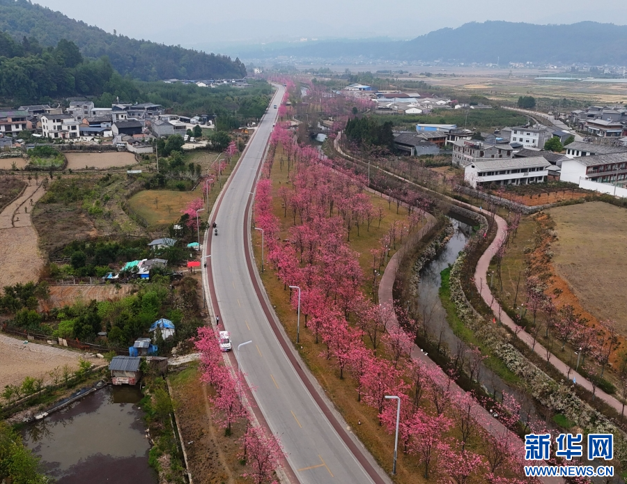 近日,云南省腾冲市北海镇樱花绽放,娇艳无比。道路被樱花的浪漫氛围点缀,吸引游人踏青赏春。新华网发(赵辉 摄)