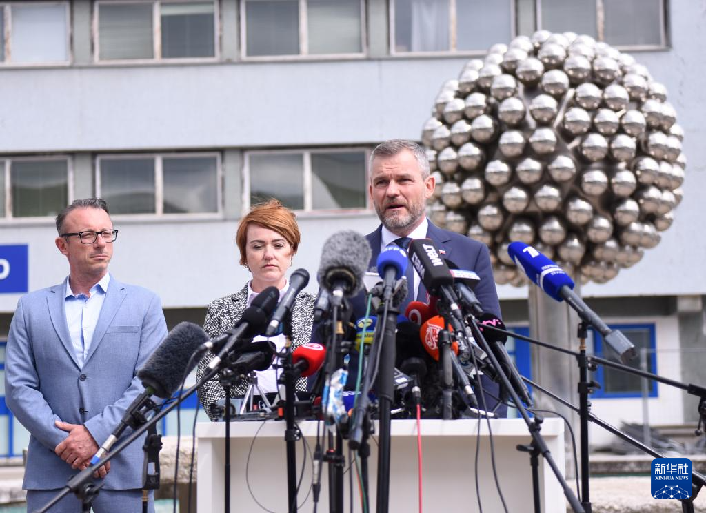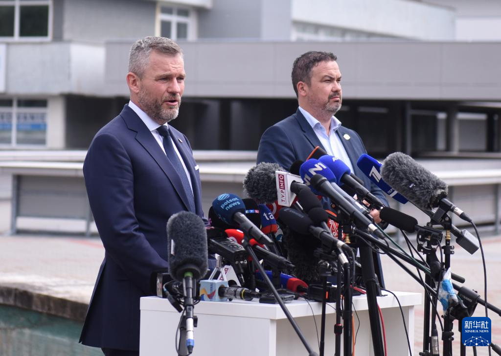 5月16日,在斯洛伐克班斯卡-比斯特里察一家医院,斯洛伐克候任总统佩列格里尼(右)对媒体讲话。新华社记者 贺灿铃 摄