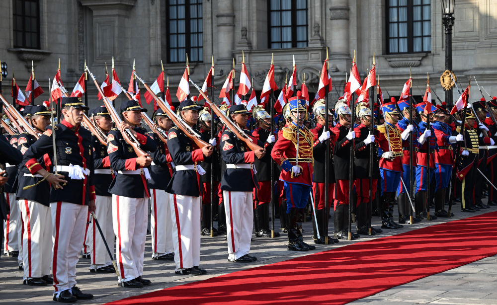 当地时间11月14日,国家主席习近平在利马出席秘鲁总统博鲁阿尔特举行的欢迎仪式。
