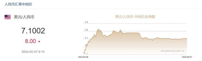 中新网5月7日电 中国人民银行授权中国外汇交易中心公布,2024年5月7日银行间外汇市场人民币汇率中间价为1美元对人民币7.1002元,下调8个基点。