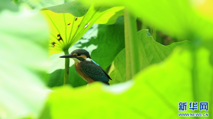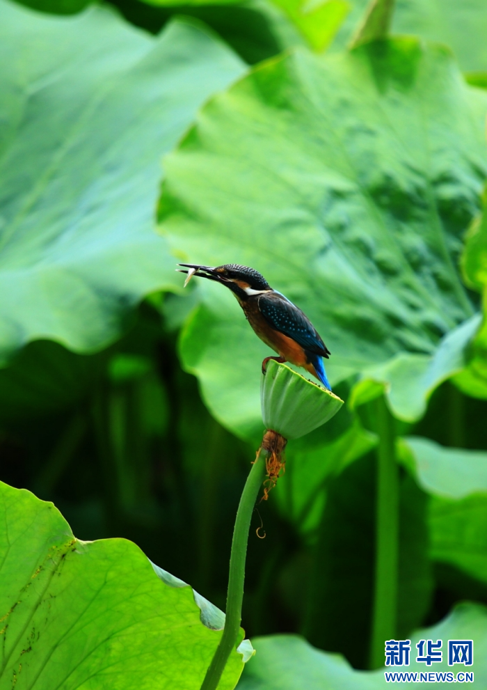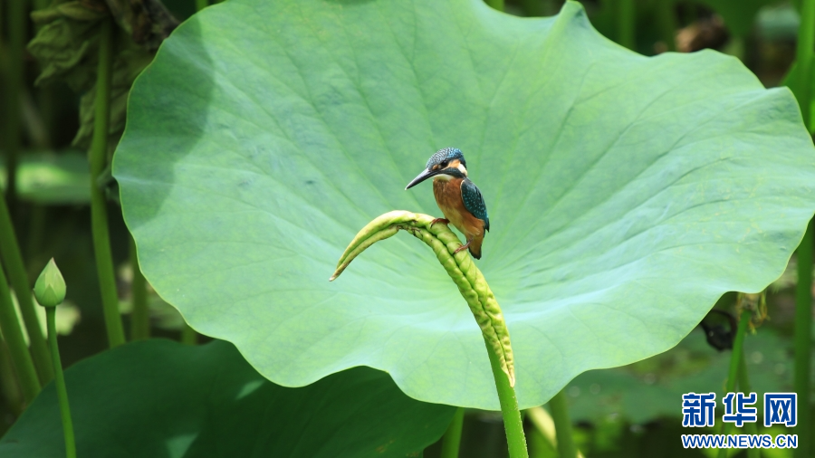 云南省腾冲市和顺镇大庄村的荷塘中,鸟儿在其间穿梭,偶尔停留(7月4日摄)。新华网发(赵辉 摄)
