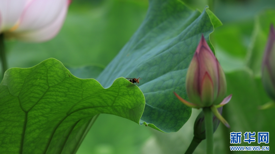 云南省腾冲市和顺镇大庄村的荷塘中,胡蜂停驻在荷叶上(7月4日摄)。新华网发(赵辉 摄)