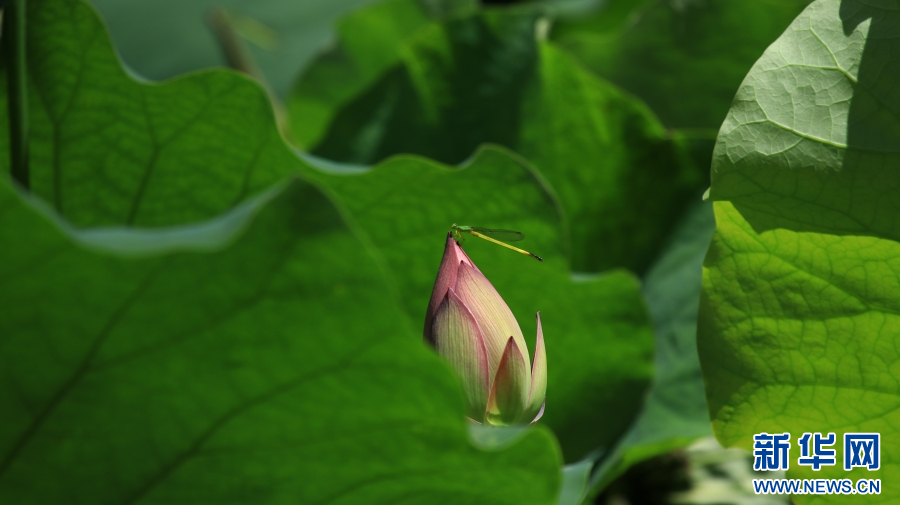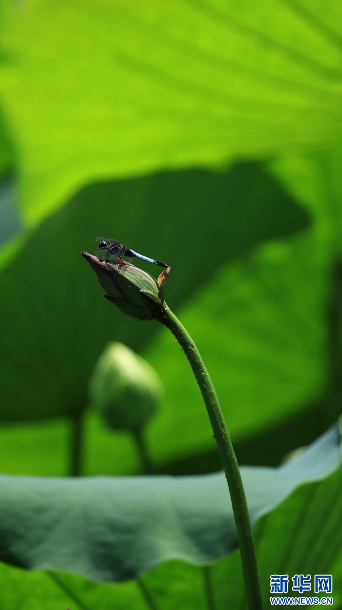 云南省腾冲市和顺镇大庄村的荷塘中,蜻蜓驻足(7月4日摄)。新华网发(赵辉 摄)