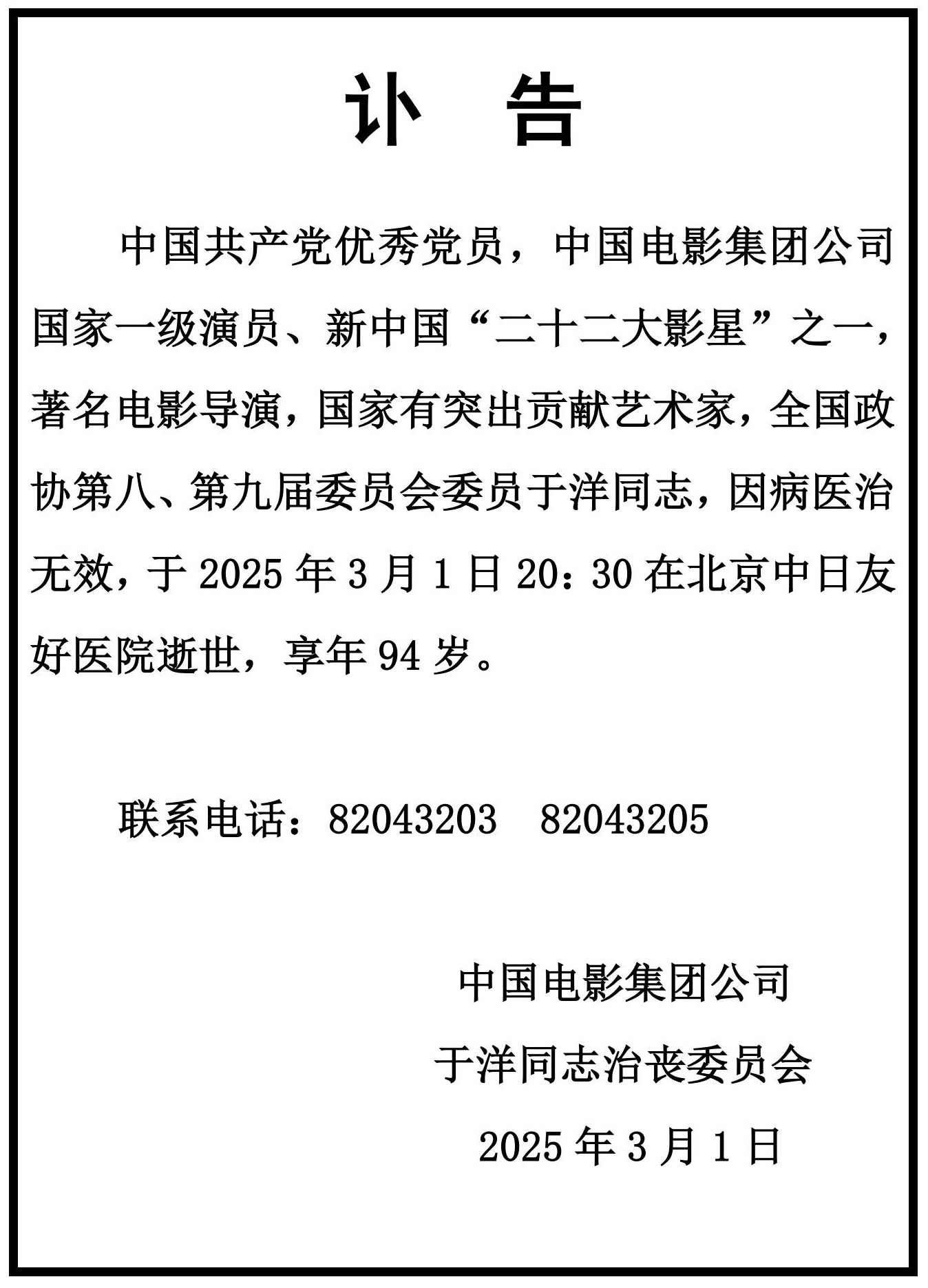 中影集团今天发布讣告,中国共产党优秀党员,中国电影集团公司国家一级演员、新中国“二十二大影星”之一,著名电影导演,国家有突出贡献艺术家,全国政协第八、第九届委员会委员于洋同志,因病医治无效,于2025年3月1日20:30在北京中日友好医院逝世,享年94岁。