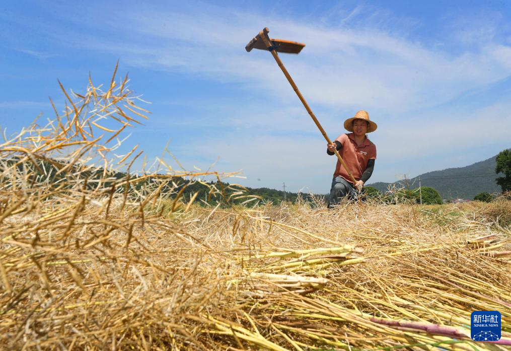 5月2日,在湖南省衡阳市衡东县杨林镇,当地村民在田间拍打油菜荚,分离油菜籽。