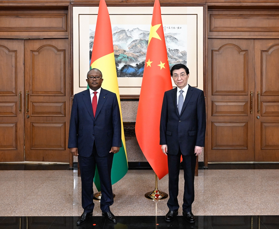 9月3日,全国政协主席王沪宁在北京会见来华出席中非合作论坛北京峰会的几内亚比绍总统恩巴洛。新华社记者 申宏 摄