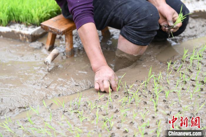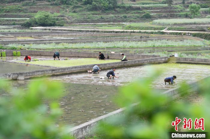 图为村民在田间栽插稻谷秧苗。陈孝新 摄