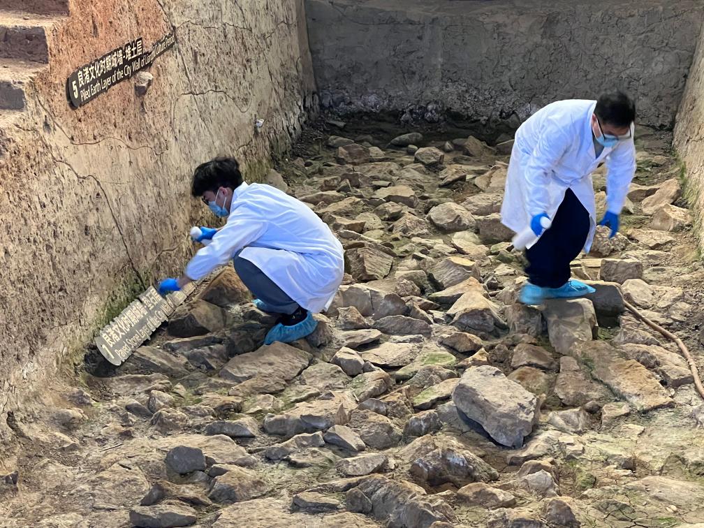 图为文保工作者在良渚古城南城墙展示点喷洒可抑制苔藓和霉菌的纯天然植物制剂。杭州良渚古城遗址世界遗产监测管理中心供图