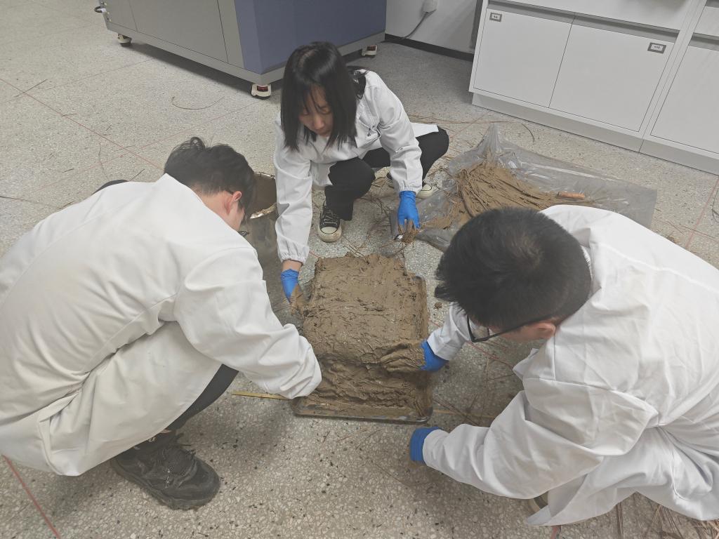 图为文保工作者在实验室里仿制良渚先民用于堆筑城墙和水坝的“草裹泥”。杭州良渚古城遗址世界遗产监测管理中心供图。