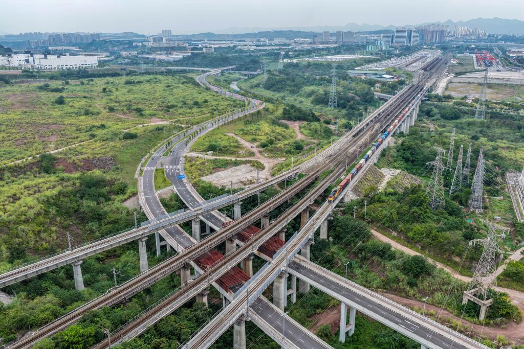 9月28日,西部陆海新通道班列在重庆鱼嘴站顺利发车(无人机照片)。新华社记者 唐奕 摄