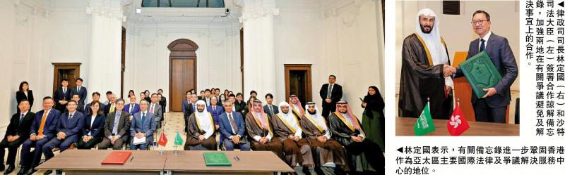 左图:林定国表示,有关备忘录进一步巩固香港作为亚太区主要国际法律及争议解决服务中心的地位。右图:律政司司长林定国(右)和沙特司法大臣(左)签署合作谅解备忘录,加强两地在有关争议避免及解决事宜上的合作。