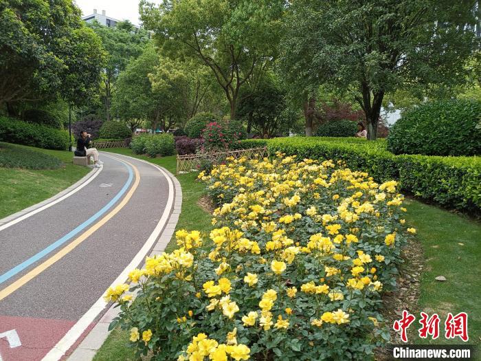 花展分会场大关公园门口花墙的月季花吸引游客拍照打卡。杭州市园林文物局 供图