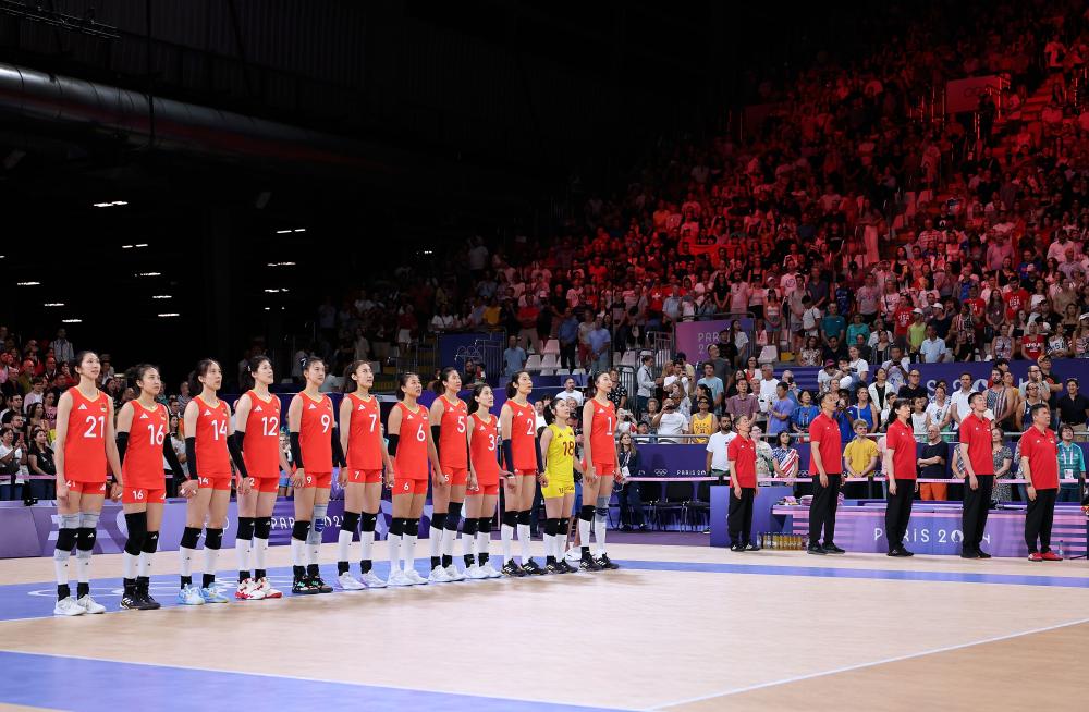 2024年7月29日,中国队球员在比赛前。当日,在巴黎奥运会女子排球小组赛中,中国队对阵美国队。新华社记者 李钢 摄