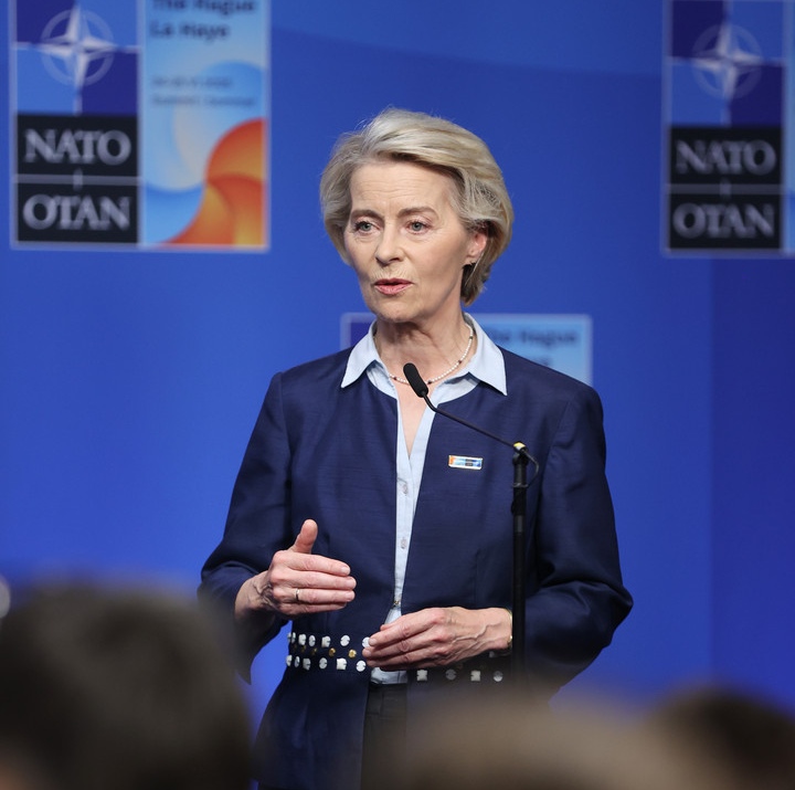 这是6月24日拍摄的欧盟委员会主席冯德莱恩在荷兰海牙北约峰会期间对记者讲话。新华社记者赵丁喆摄