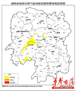 根据地质灾害成灾规律和孕灾条件,结合5月26日短期气象预报情况,省自然资源厅与省气象局联合会商得出如下结论:自5月26日20:00至27日20:00,受降雨影响,湘中、湘西南部分区域发生突发性地质灾害风险较高(黄色预警)。