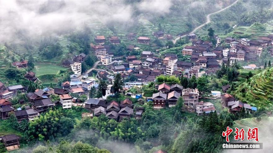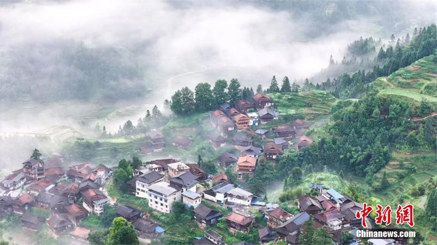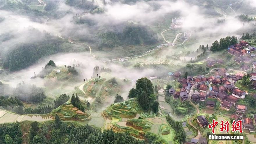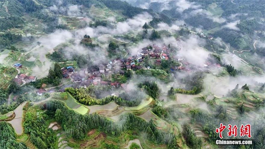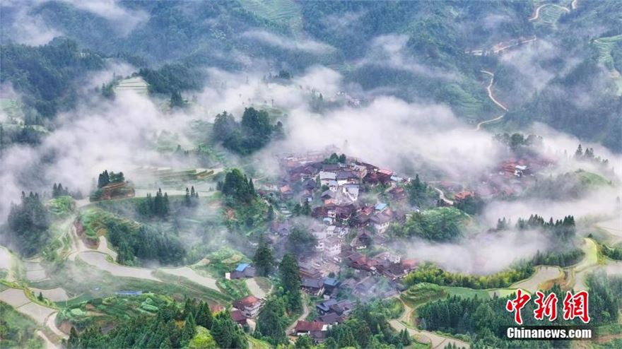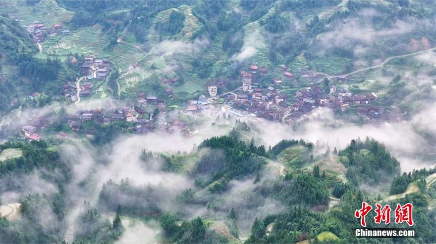 6月15日,雨后转晴的广西柳州市融水苗族自治县杆洞乡尧告村,空气清新,云雾缭绕,若隐若现宛若天空之城。