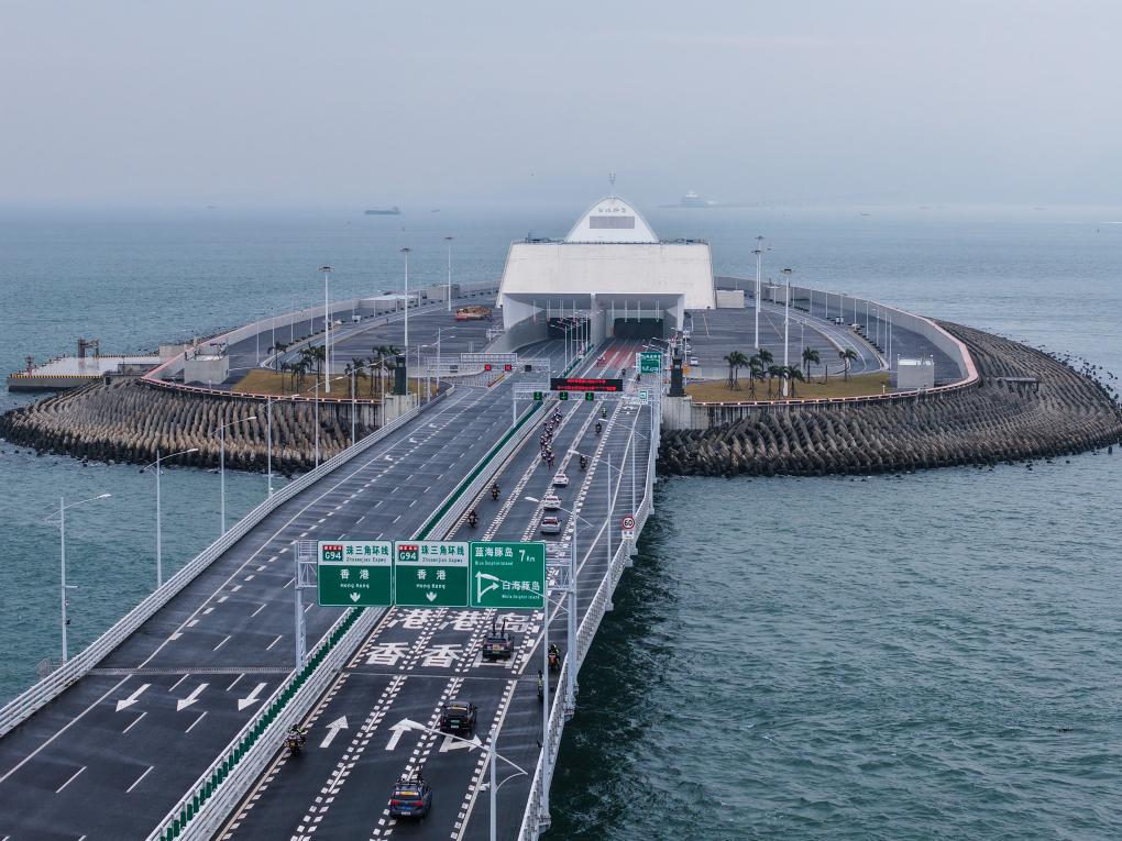 11月24日,参赛选手骑行到港珠澳大桥海底隧道西入口(无人机照片)。新华社记者 刘大伟 摄