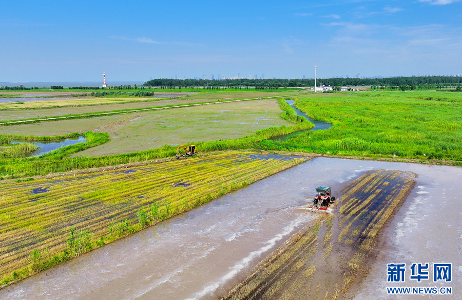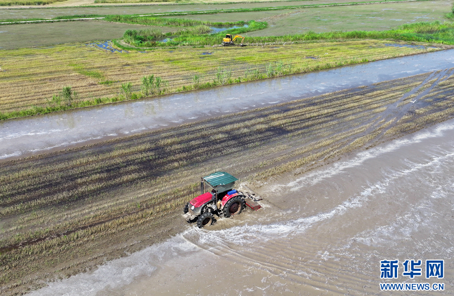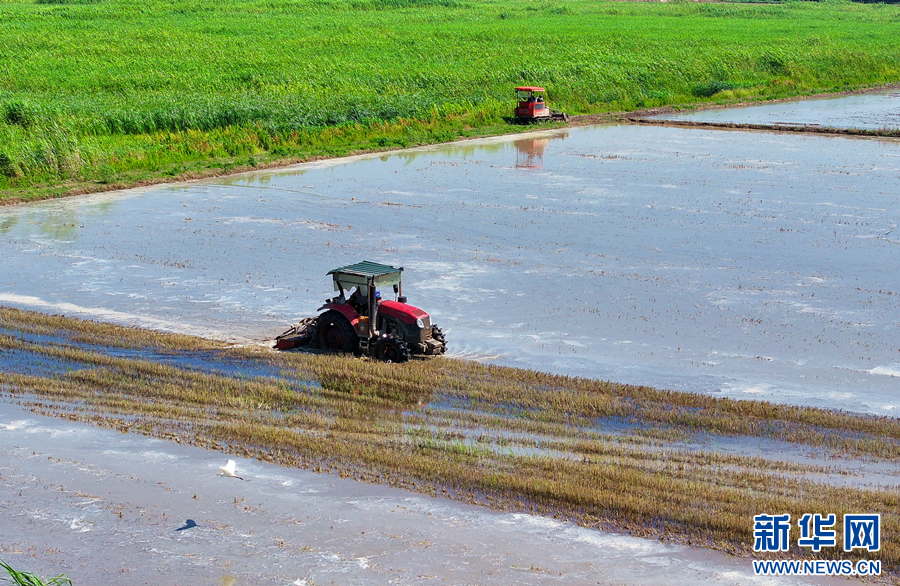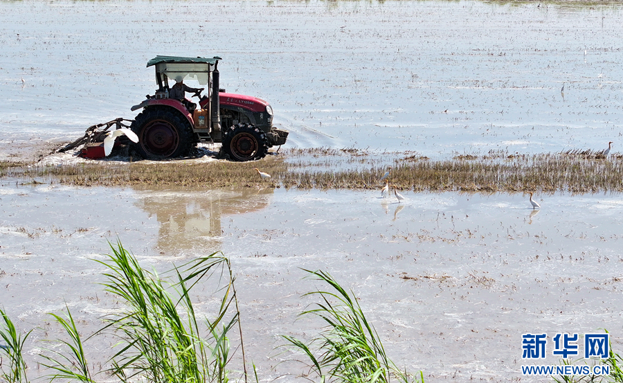 5月29日,在安徽省合肥市肥东县长临河镇的一处农田里,农机手驾驶农机在翻耕稻田。初夏时节,当地农民抢抓农时,积极开展夏耕夏种夏管等农事生产,田间地头一派繁忙景象。新华网发(陈振 摄)