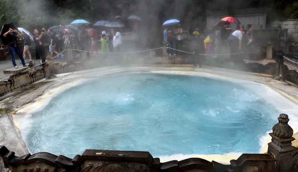 2015年7月21日,游客在云南腾冲热海景区参观“大滚锅”。新华社记者 蔺以光 摄