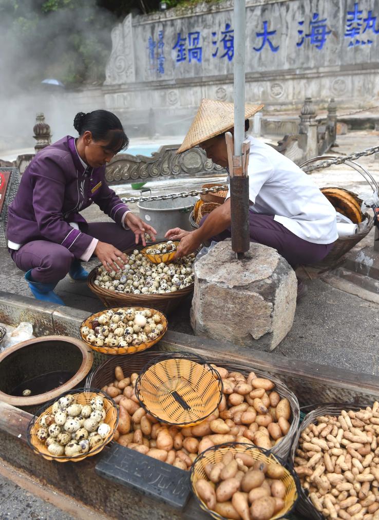 2015年7月21日,两名工作人员在腾冲热海景区将用地热蒸熟的花生、土豆等食品向游客出售。新华社记者 蔺以光 摄