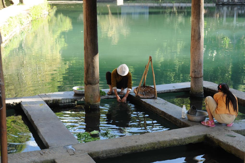 2008年11月26日,两位村民正在洗衣亭洗菜。新华社记者 秦晴 摄