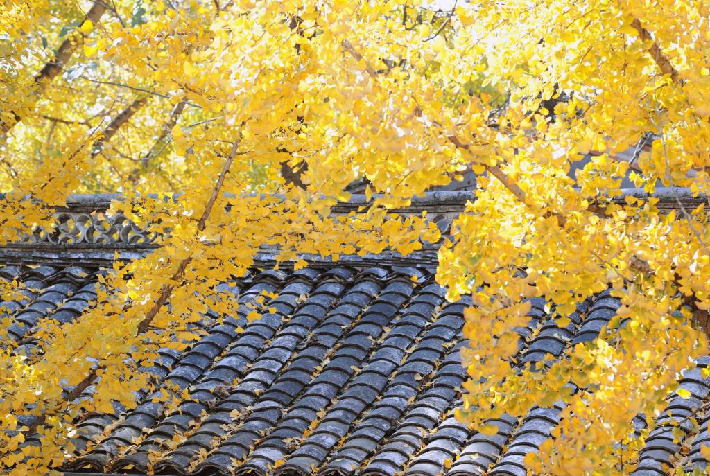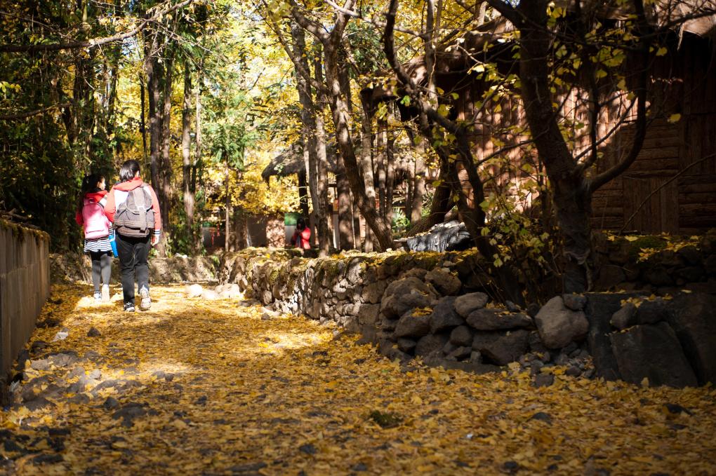 2015年11月25日,两名游客走在银杏村街道上。新华社记者 吕帅 摄