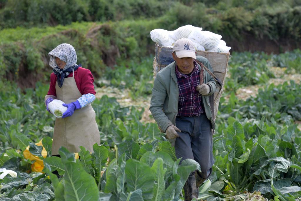 8月12日,在榆中县马坡乡上庄村,村民使用背篼将采摘的散花菜背出菜地。新华社记者 范培珅 摄