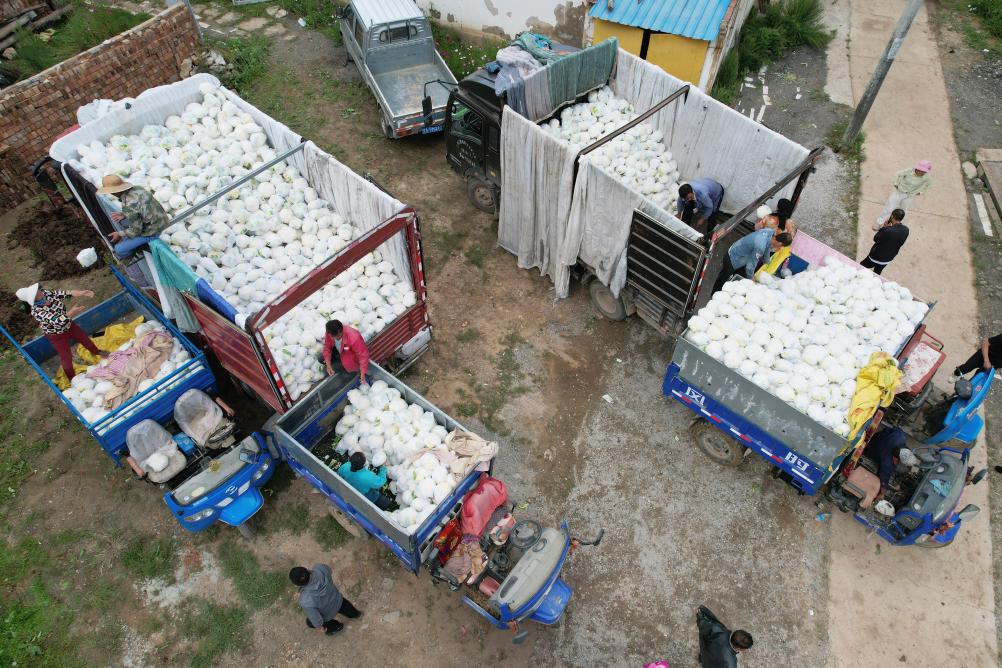 8月12日,在榆中县马坡乡上庄村,蔬菜收购商将收购的散花菜装车(无人机照片)。新华社记者 范培珅 摄